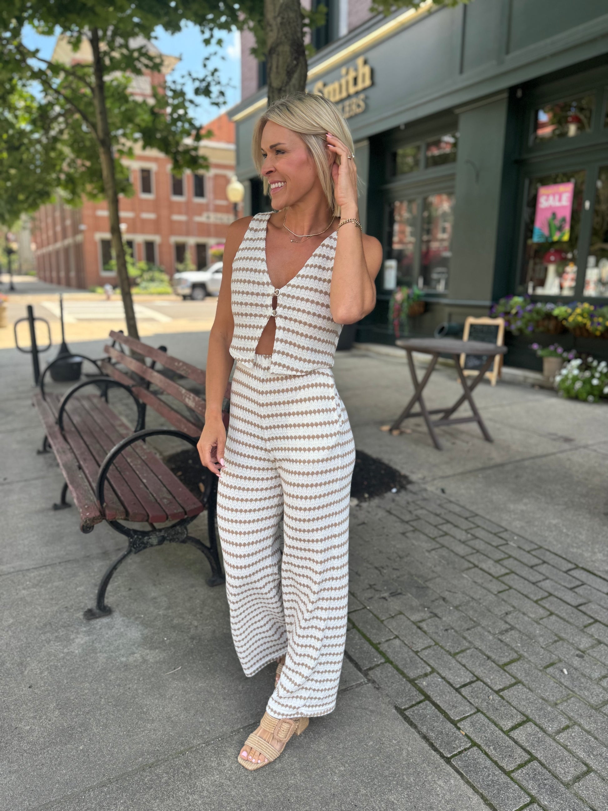 cropped wide leg, open front vest top, two buttons, fits true to size,