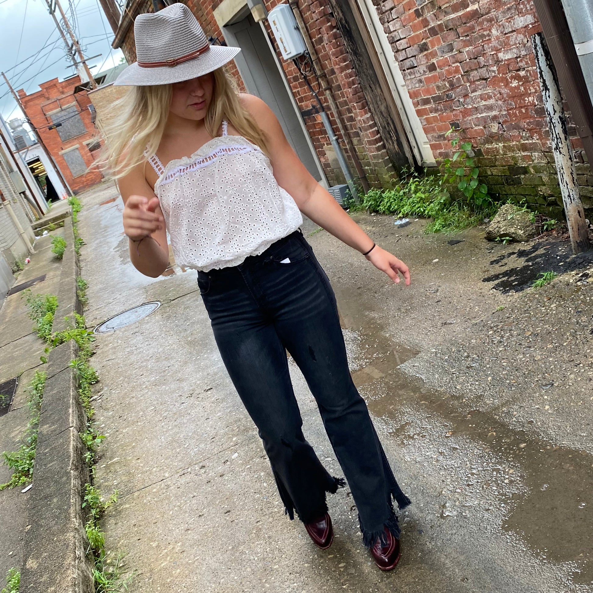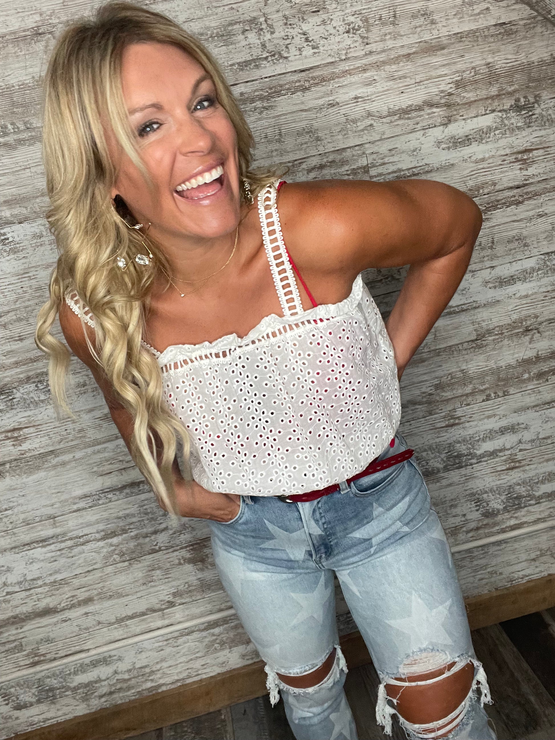 This tank is so cute on. For a cropped fit the elastic band will give you the tucked look
