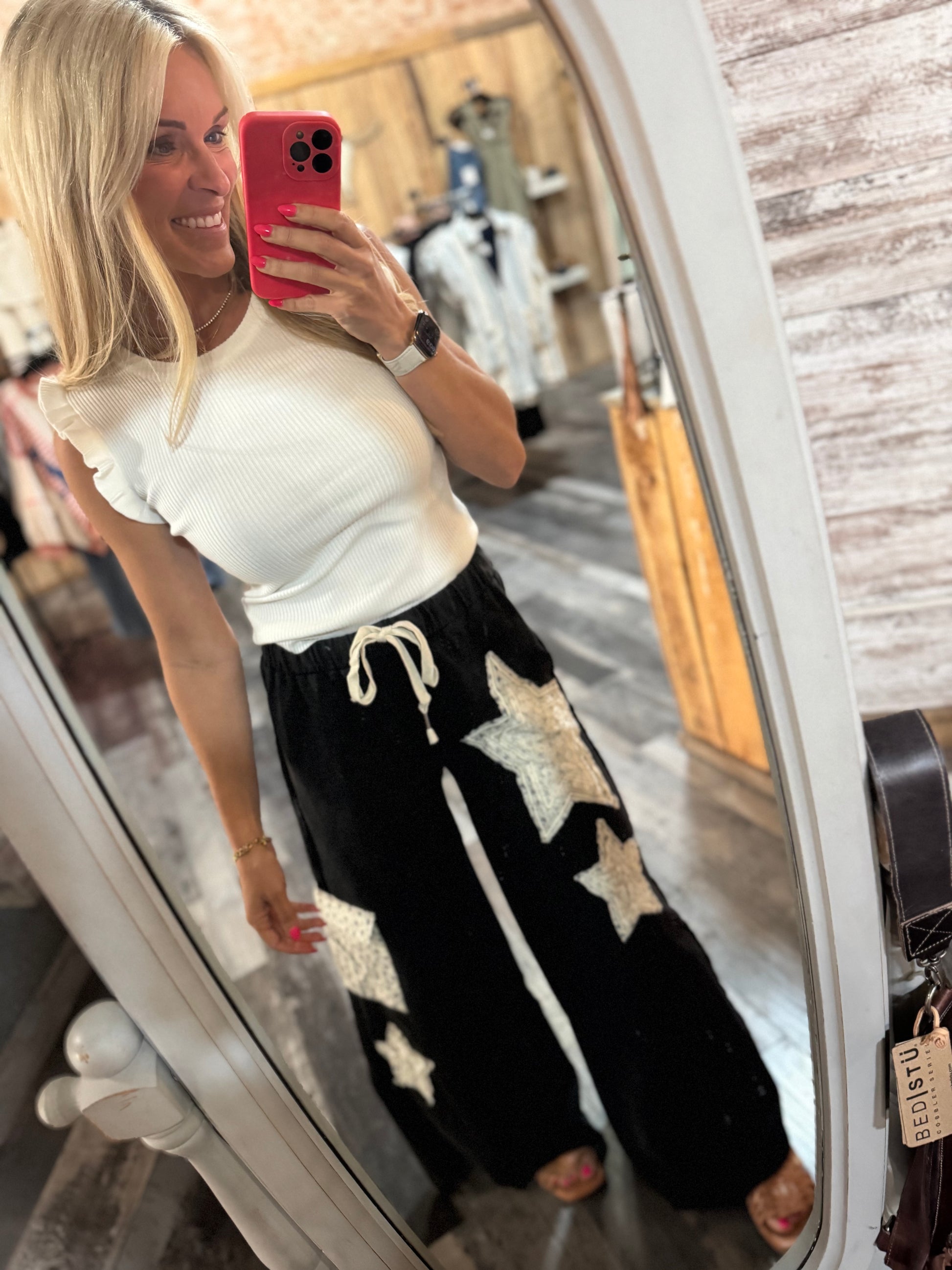 soft pull on pant, with floral cargo pocket, draw string front, elastic band waist, BY POL