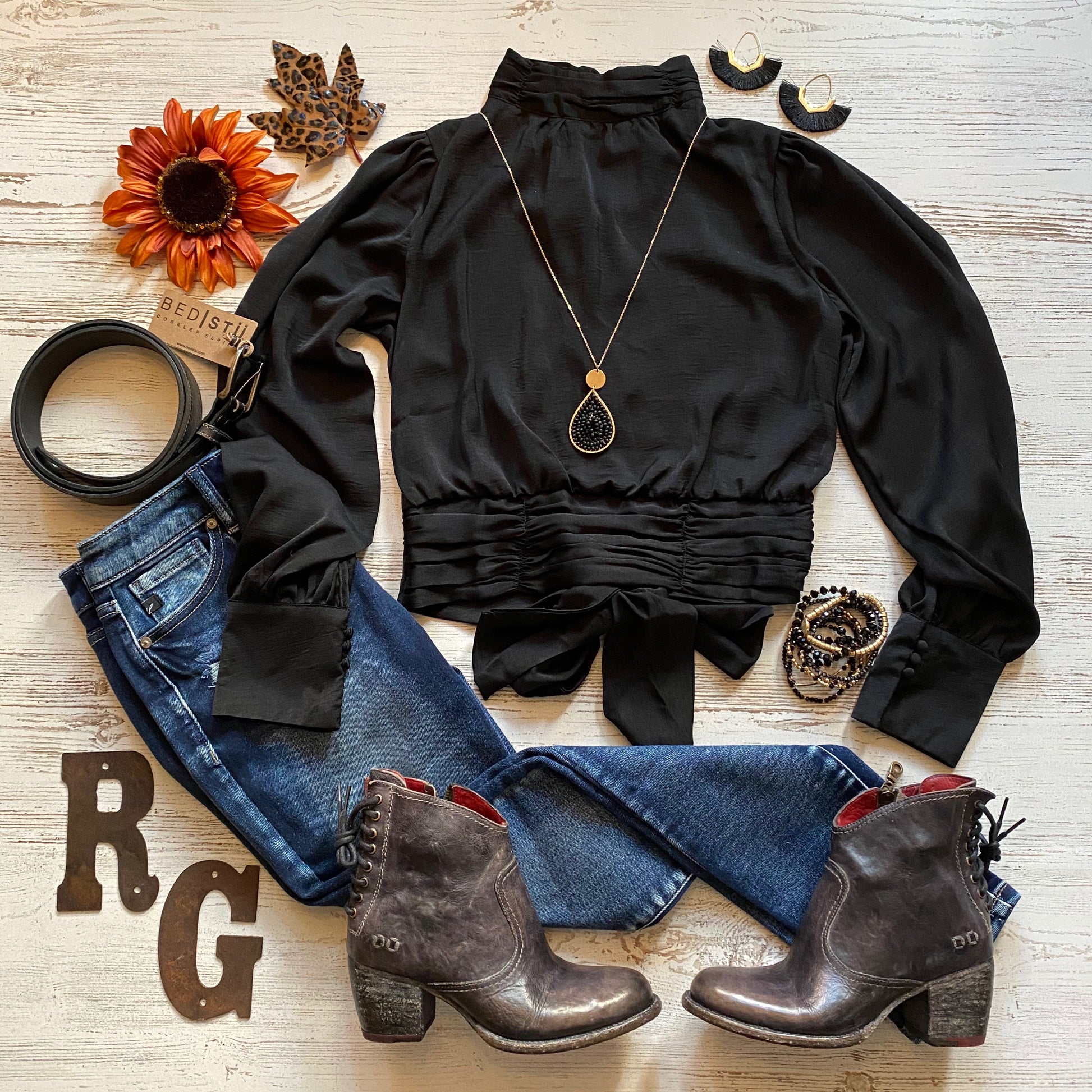 A dressy cropped blouse with a cinched waist and mock neck. This top has a bow tie back and peek-a-boo opening!
