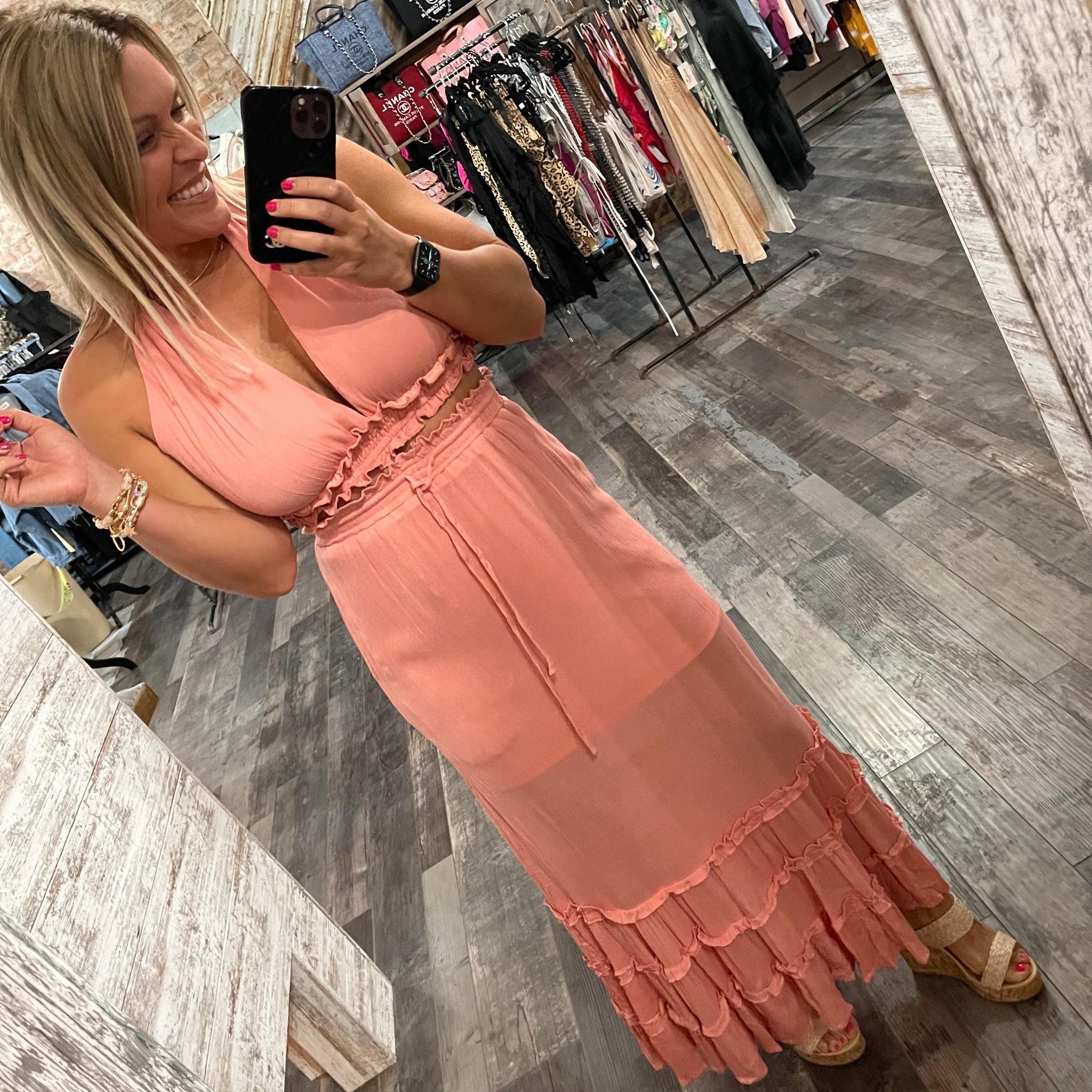 Bottom- elastic waist band, maxi length