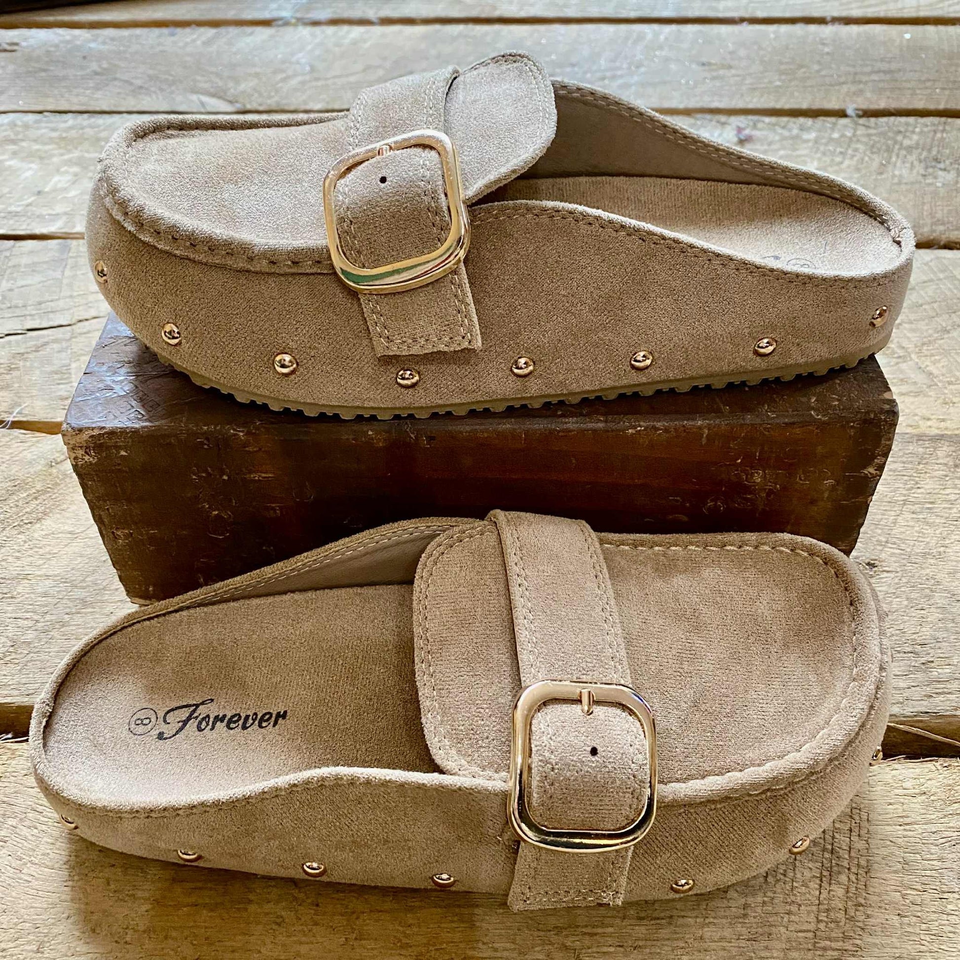 step up your slide with this cute sued fabric finish w/cute gold buckle