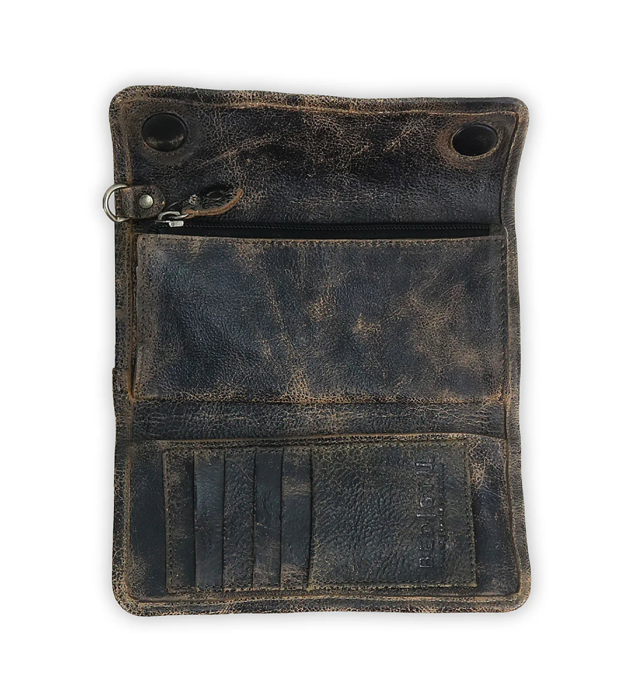- Interior contains 1 zippered pocket, 1 slip pocket, and 6 credit card slots