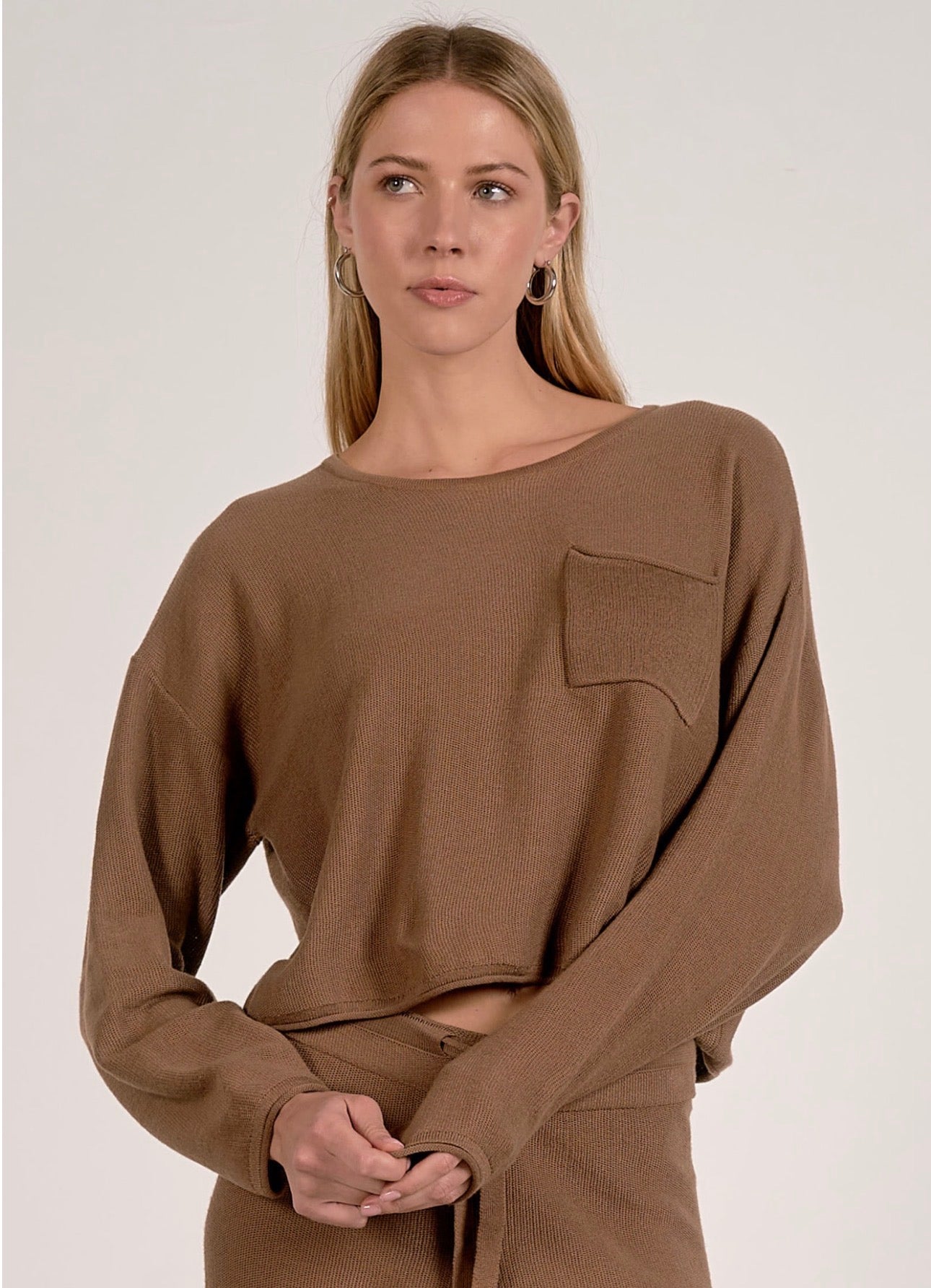 soft, cropped brown top, front pocket, by Elan