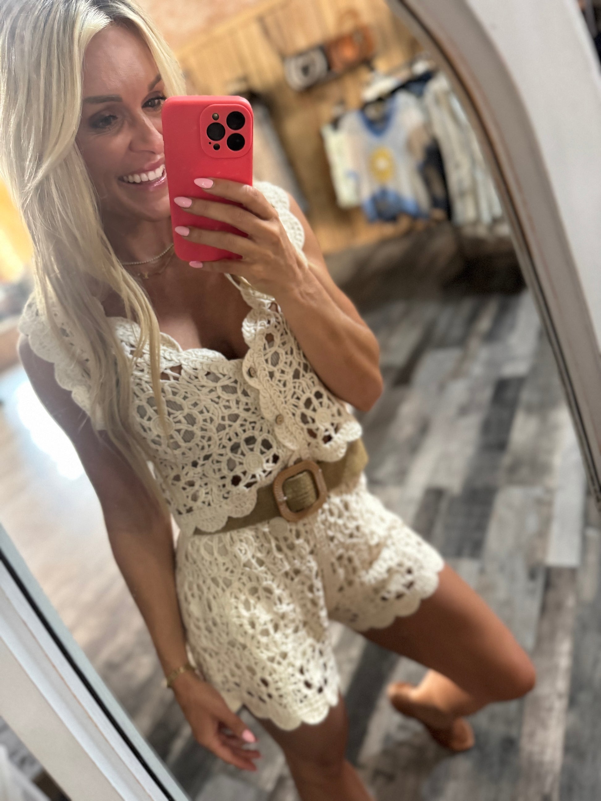 Fully lined shorts with elastic band, cute crop vest top that can we worn with bralette under or with top under for a vest look