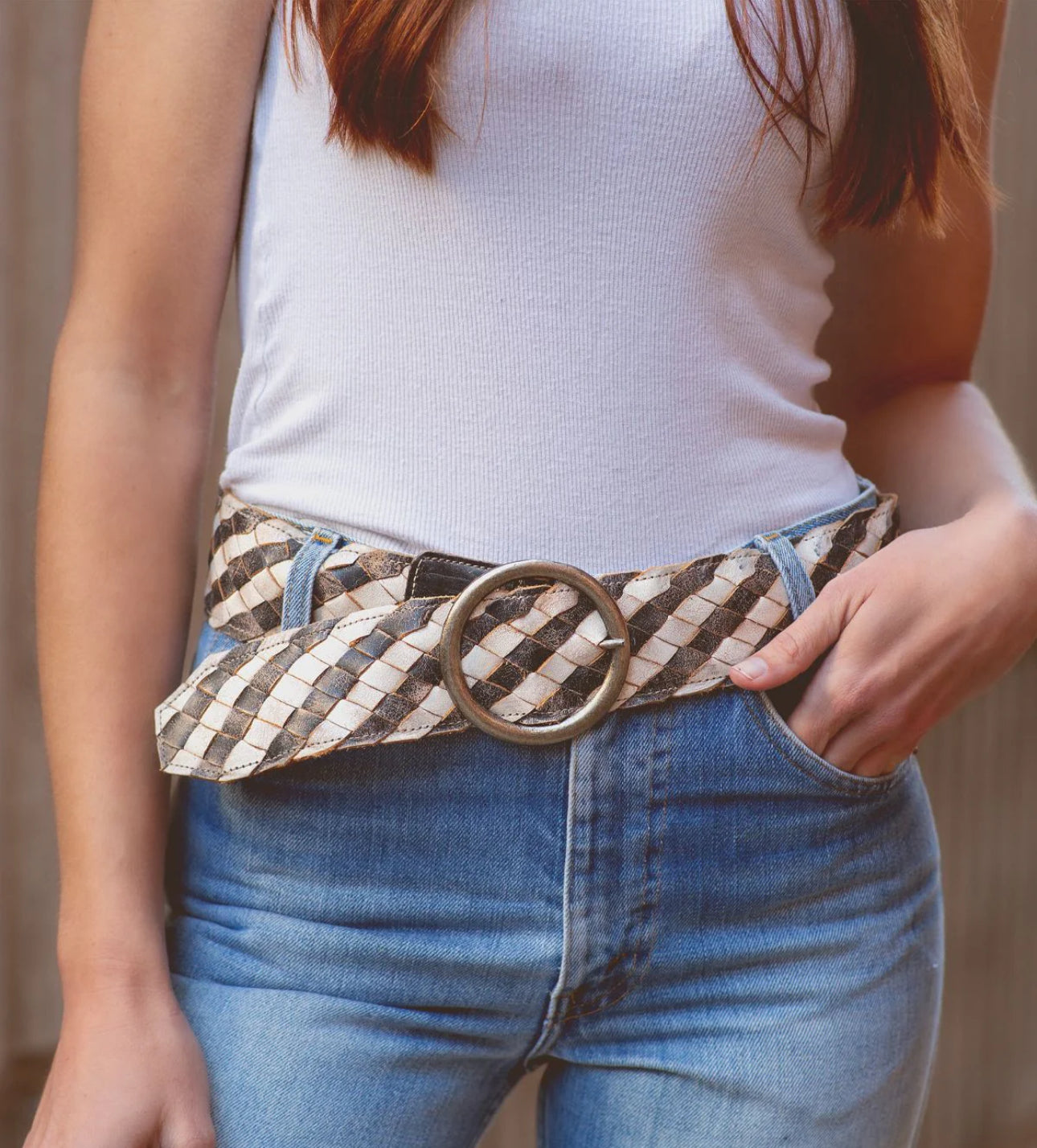 Created from meticulously woven distressed leather and adorned with a round brass-tone buckle, the Dreamweaver effortlessly infuses a touch of vintage allure into your style. Whether worn on the waist or the hip, this belt stands as a remarkable addition to any wardrobe.