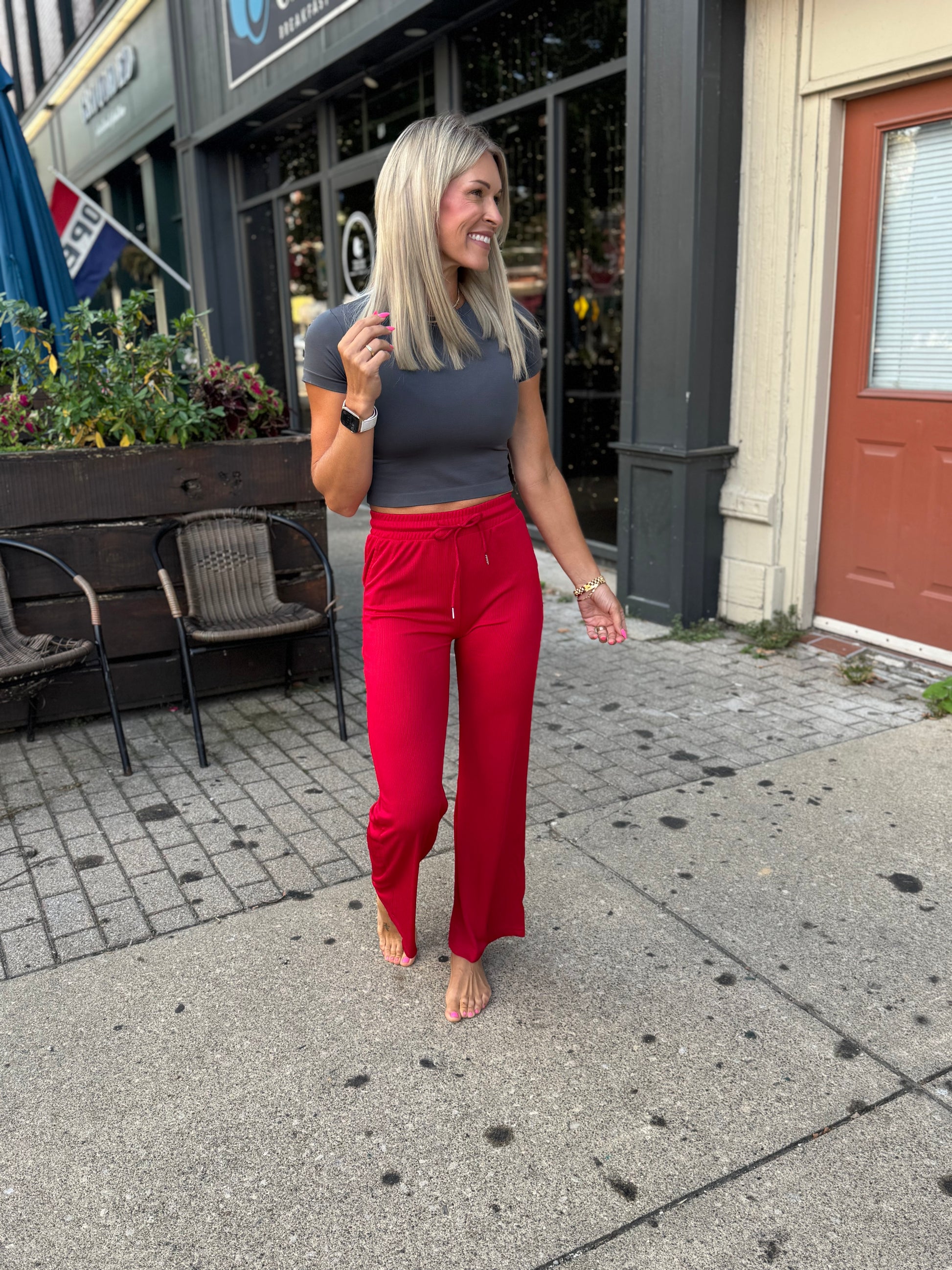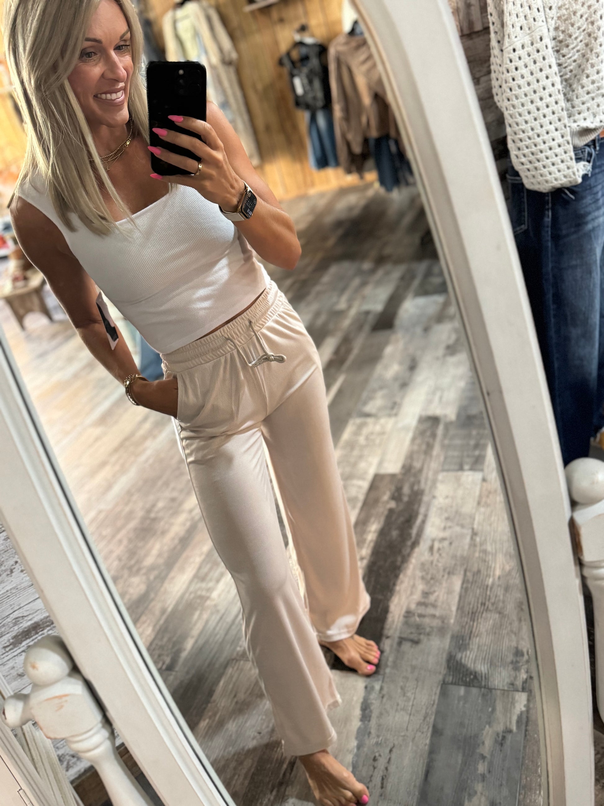 fitted ribbed stretch pant, pockets, elastic waist, fits lil small, great causal pant