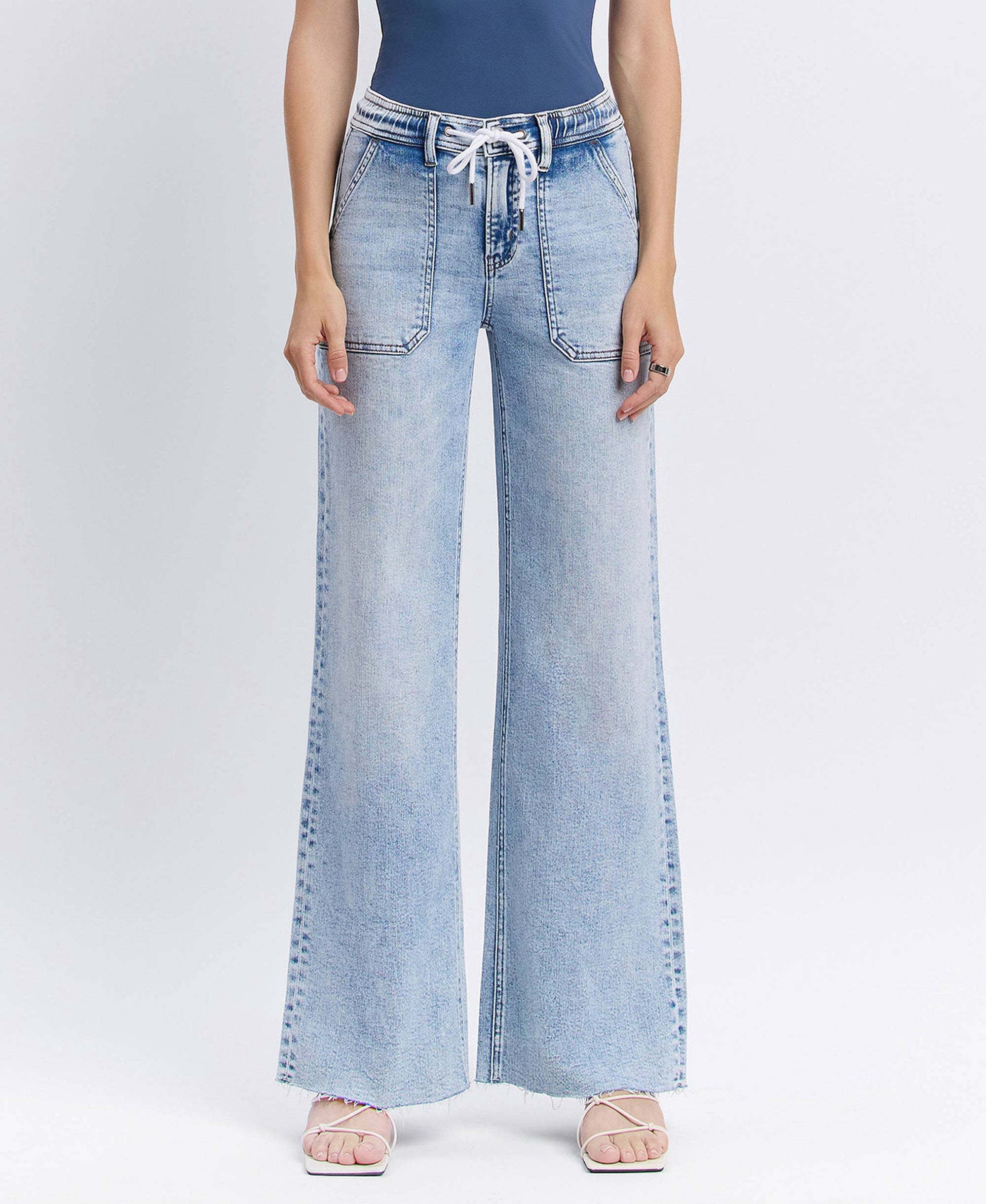 HIGH RISE DRAWSTRING WAISTBAND WIDE LEG JEANS