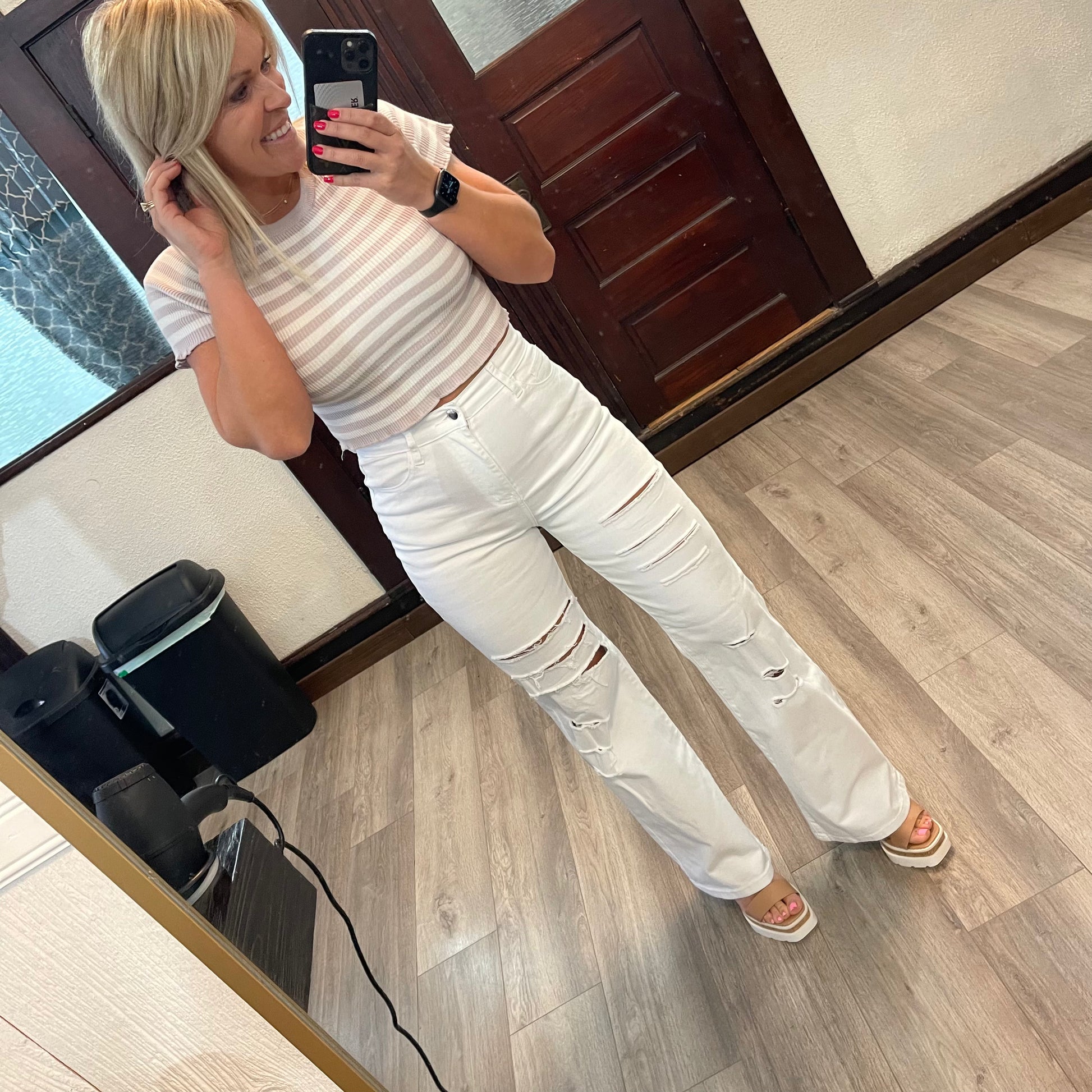 -STRETCH DENIM, HIGH RISE, DISTRESSED DETAILS, WIDE LEG