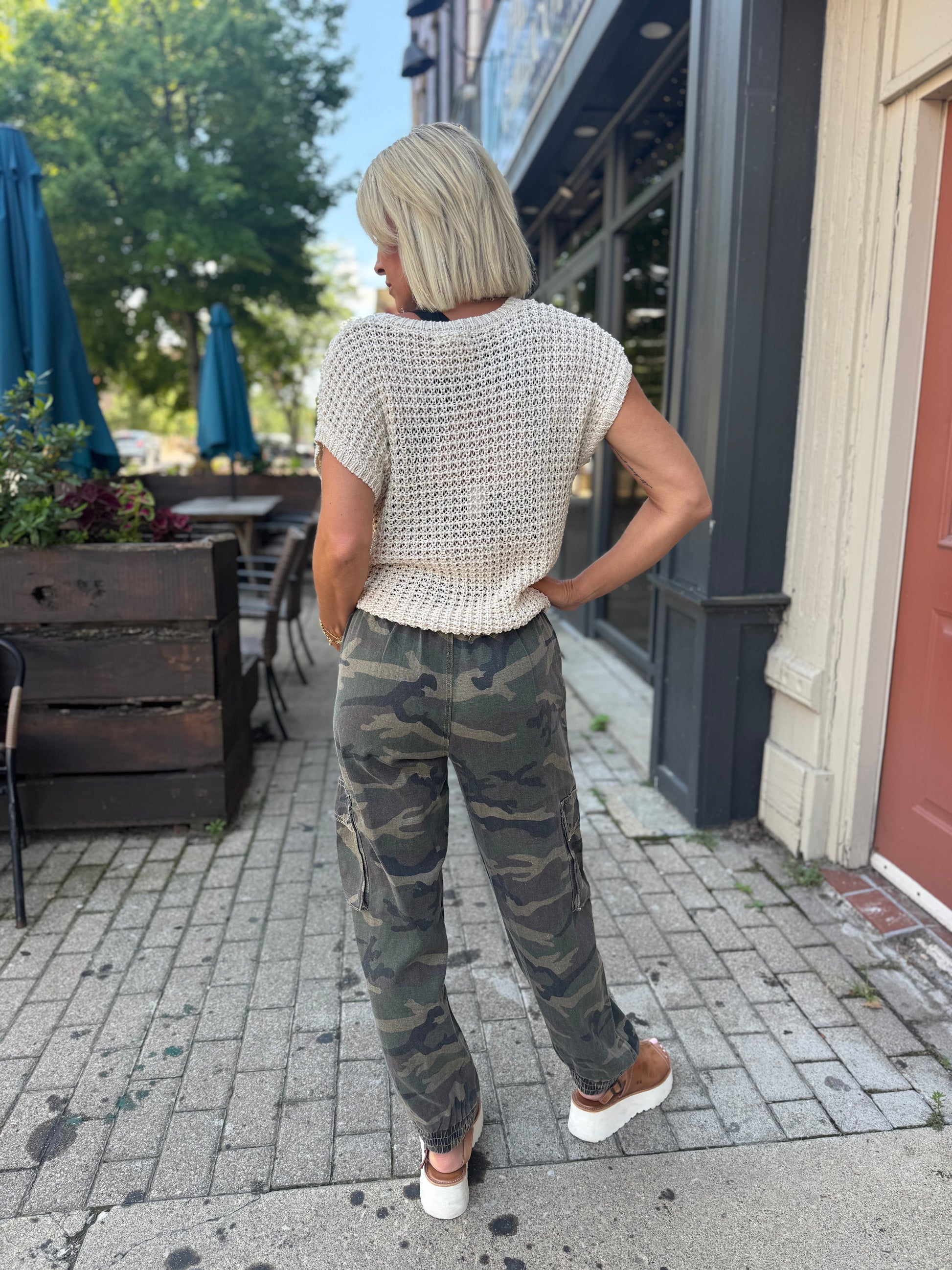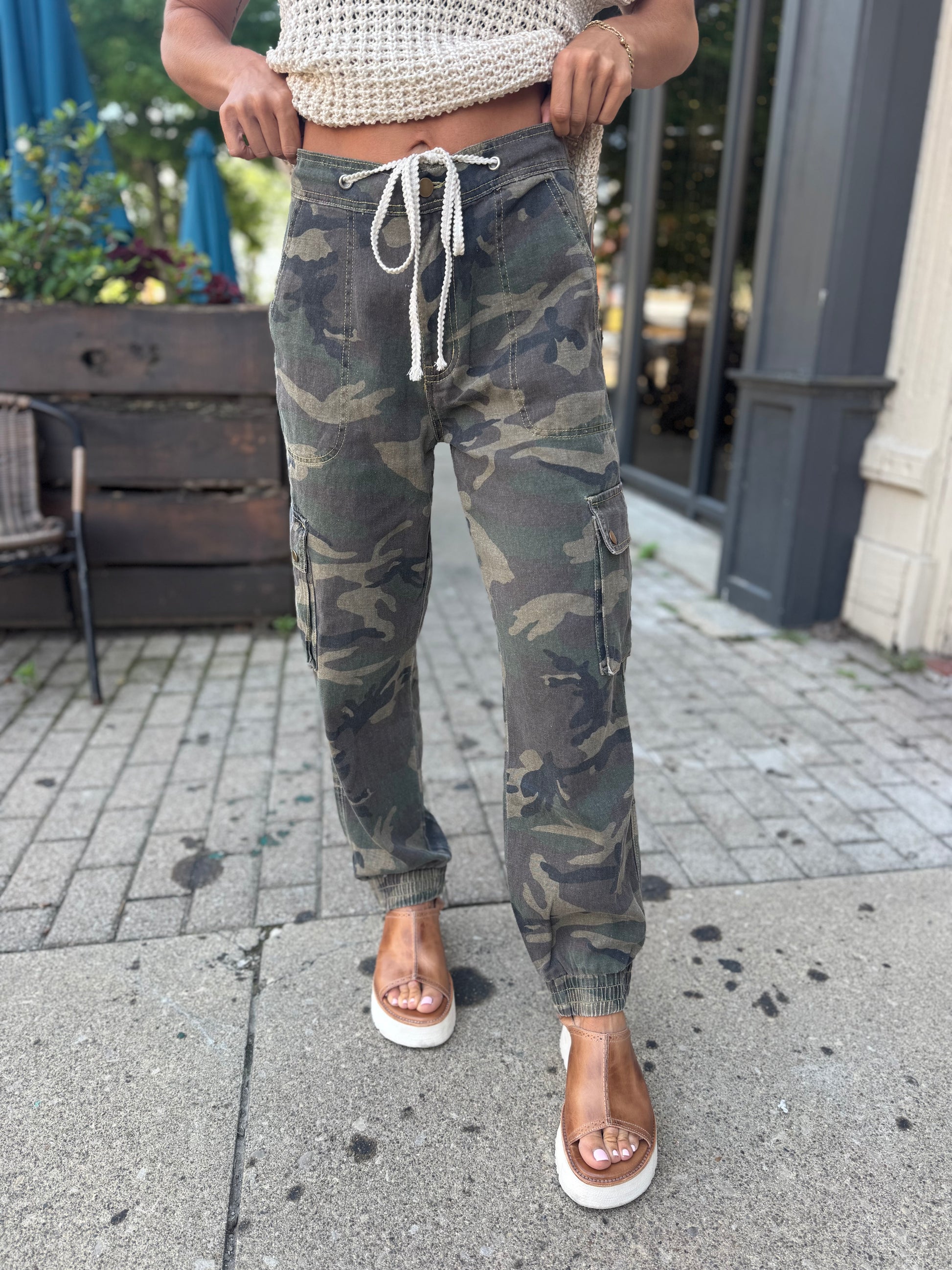 oversized comfy fit, camo cargo pant, by POL, elastic band waist