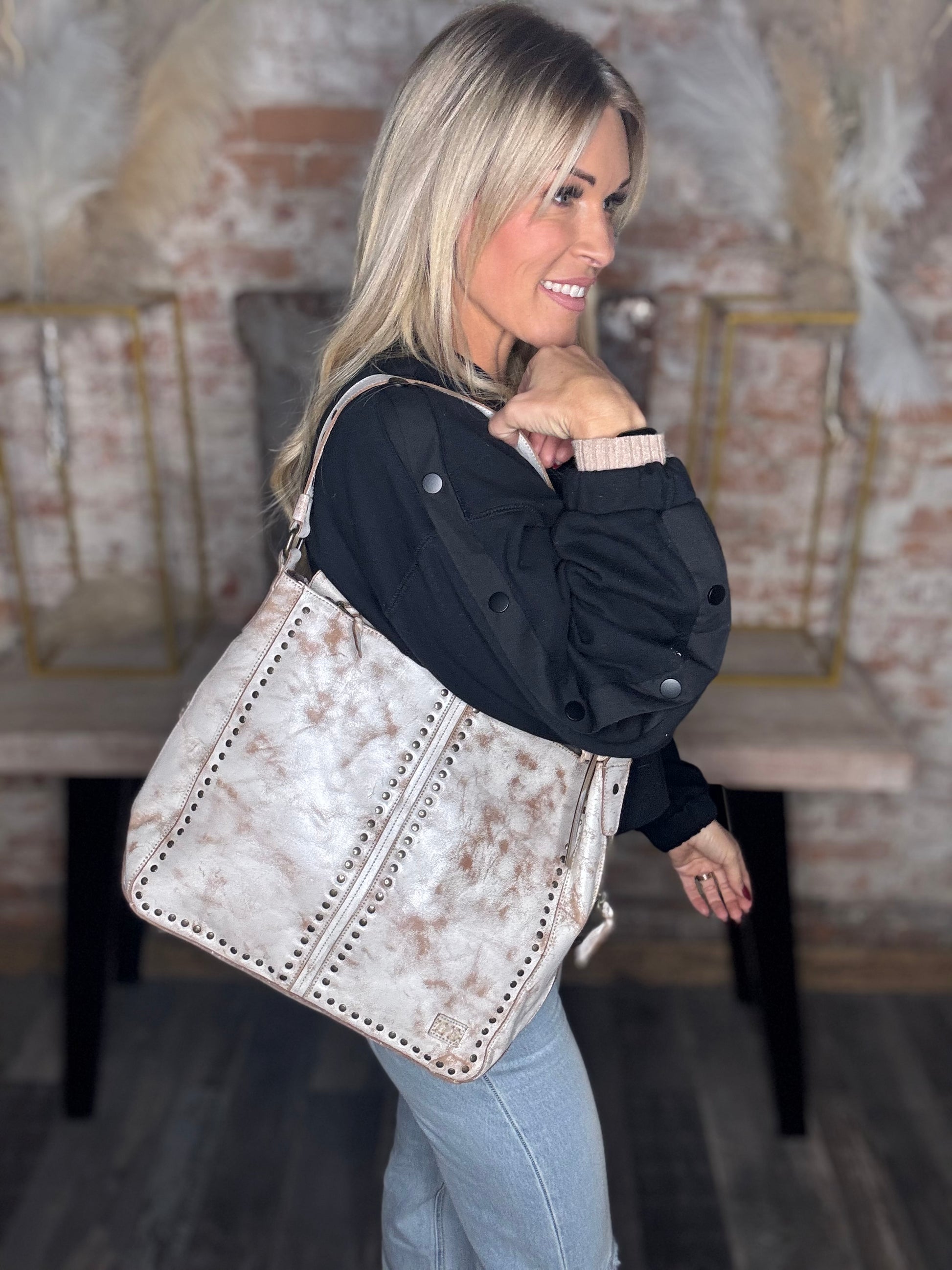- Shoulder tote bag with stud details and feet to stand upright, zip top closure