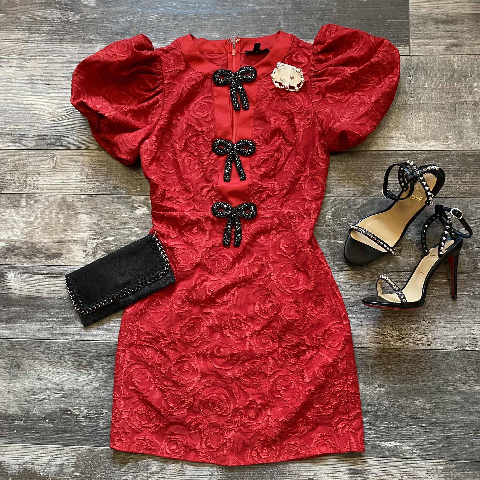 beautiful red dress, black bow tie front, puff sleeve, zip up back