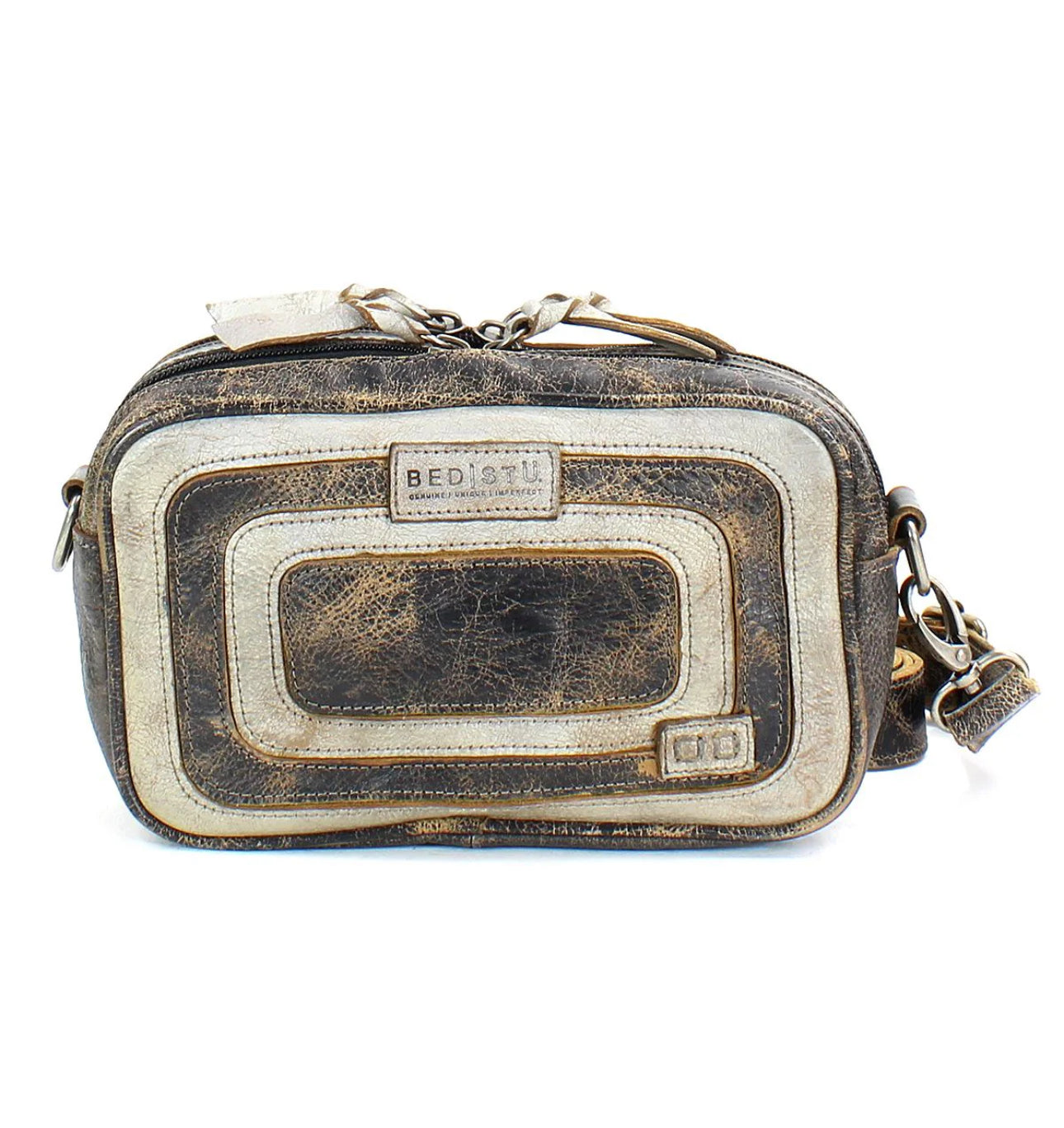 - Two-toned rectangular crossbody with leather overlays and piping for dramatic stand-out style