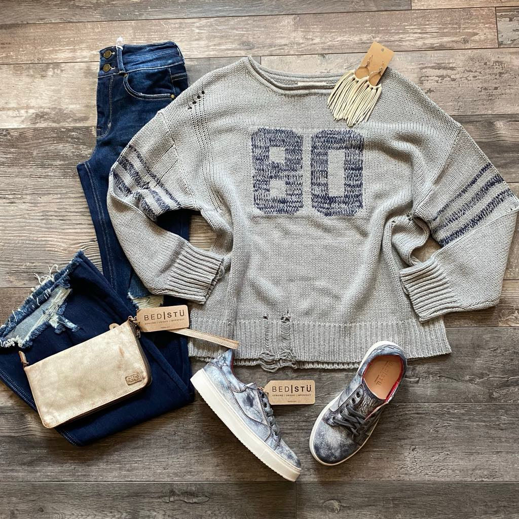 grey distress pullover, with 80 print on front, stripes on sleeve, oversized fit
