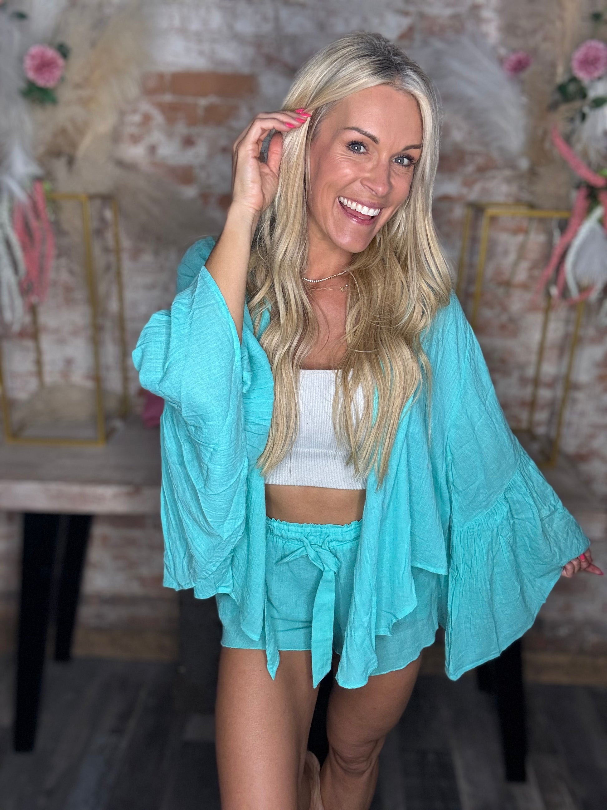 elastic band shorts, seafoam color, pairs great with by the seal tie top
