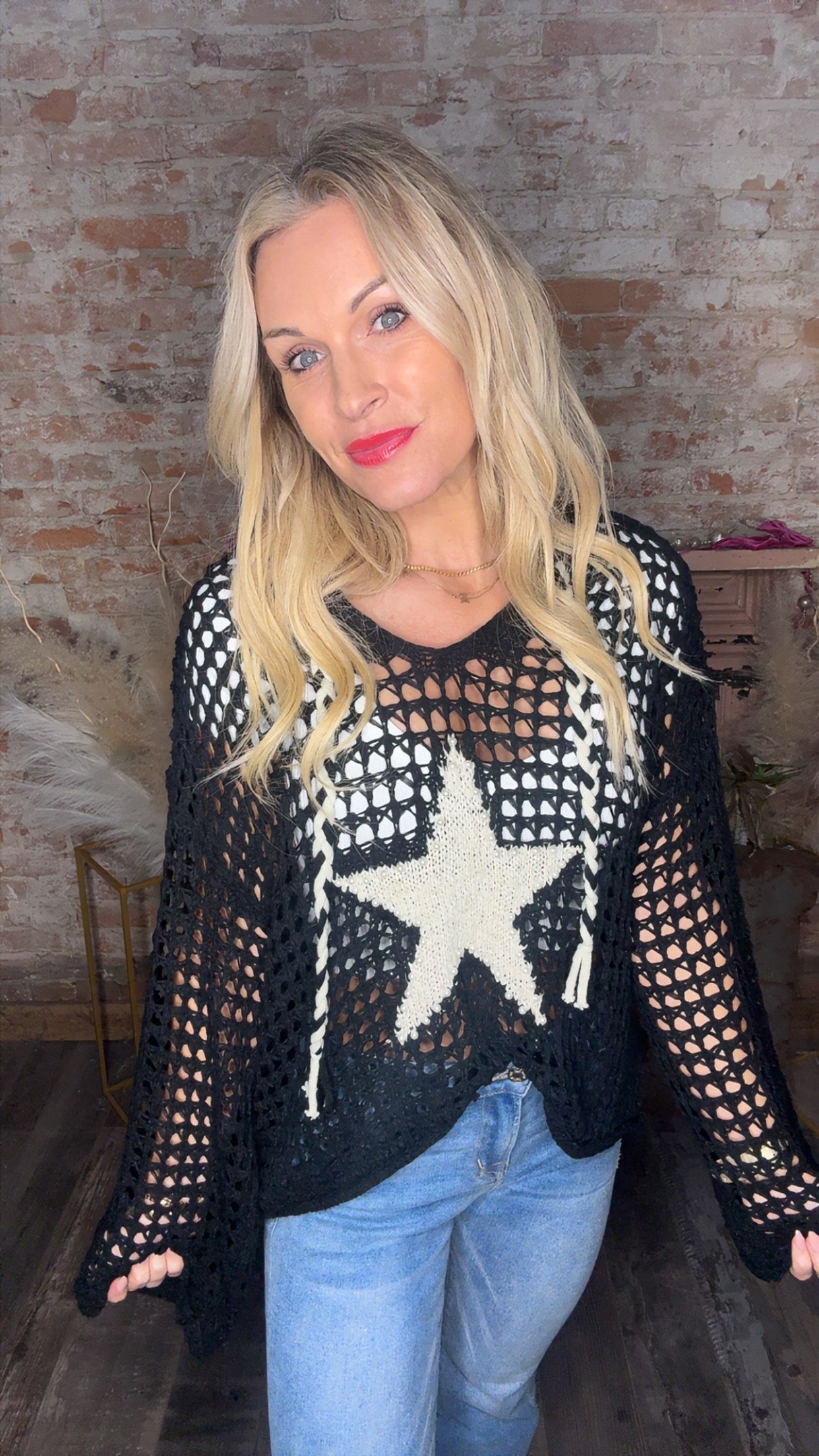pull over round neck sweater, star patch, pear studded by POL