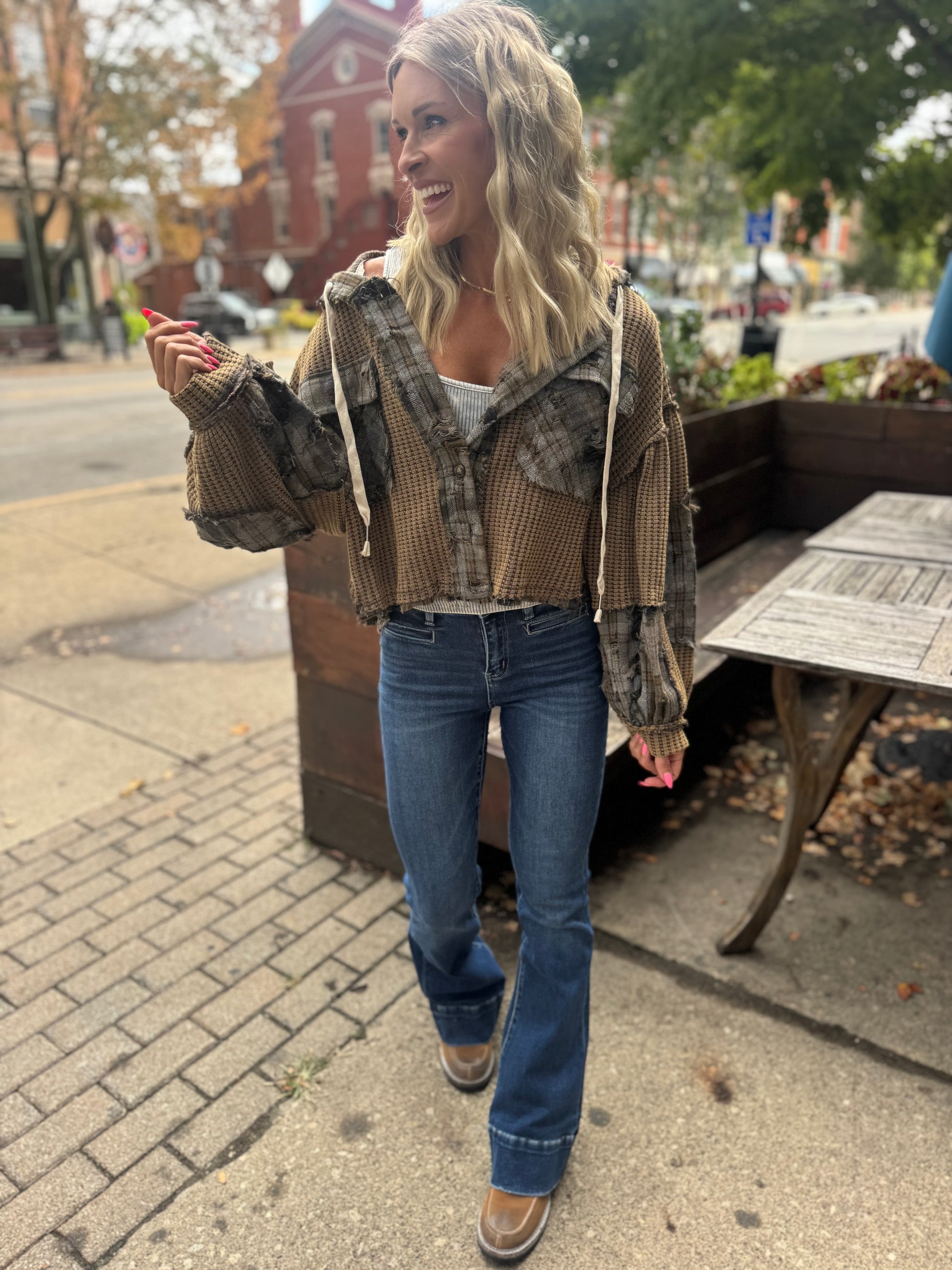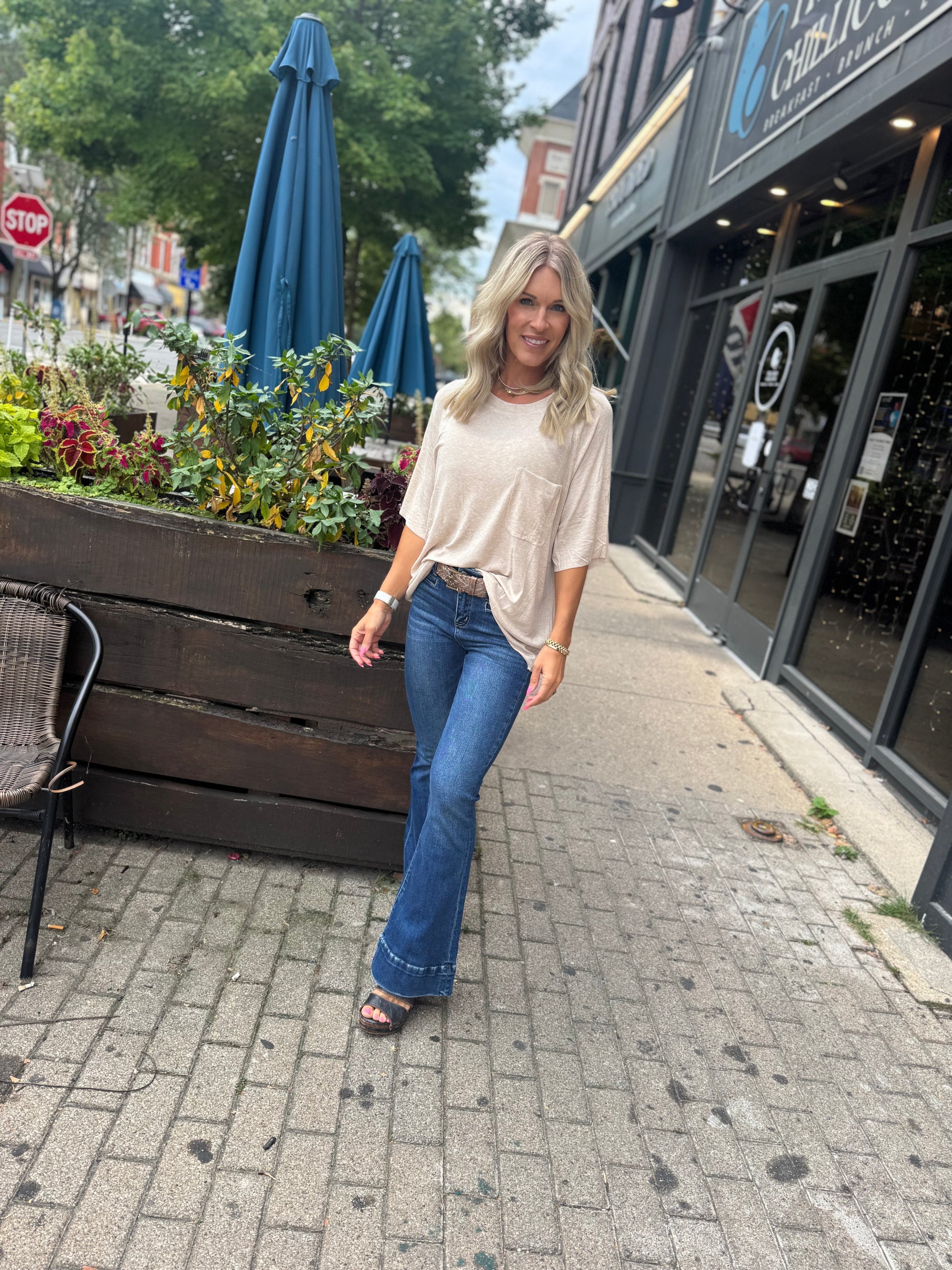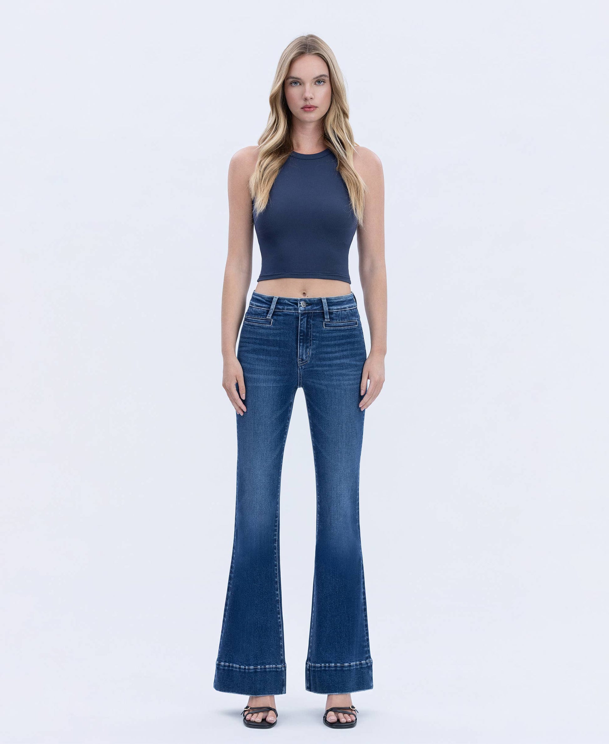 HIGH RISE WELT POCKETED TROUSER HEM FLARE JEANS COMFORT STRETCH DENIM, HIGH RISE WAIST, WELT POCKET, TROUSER HEM, FULL LENGTH, FLARE JEANS F. RISE: 10 1/4" / INSEAM: 32" / LEG OPENING: 22" MODEL IS 5'10" WEARING A SIZE 26