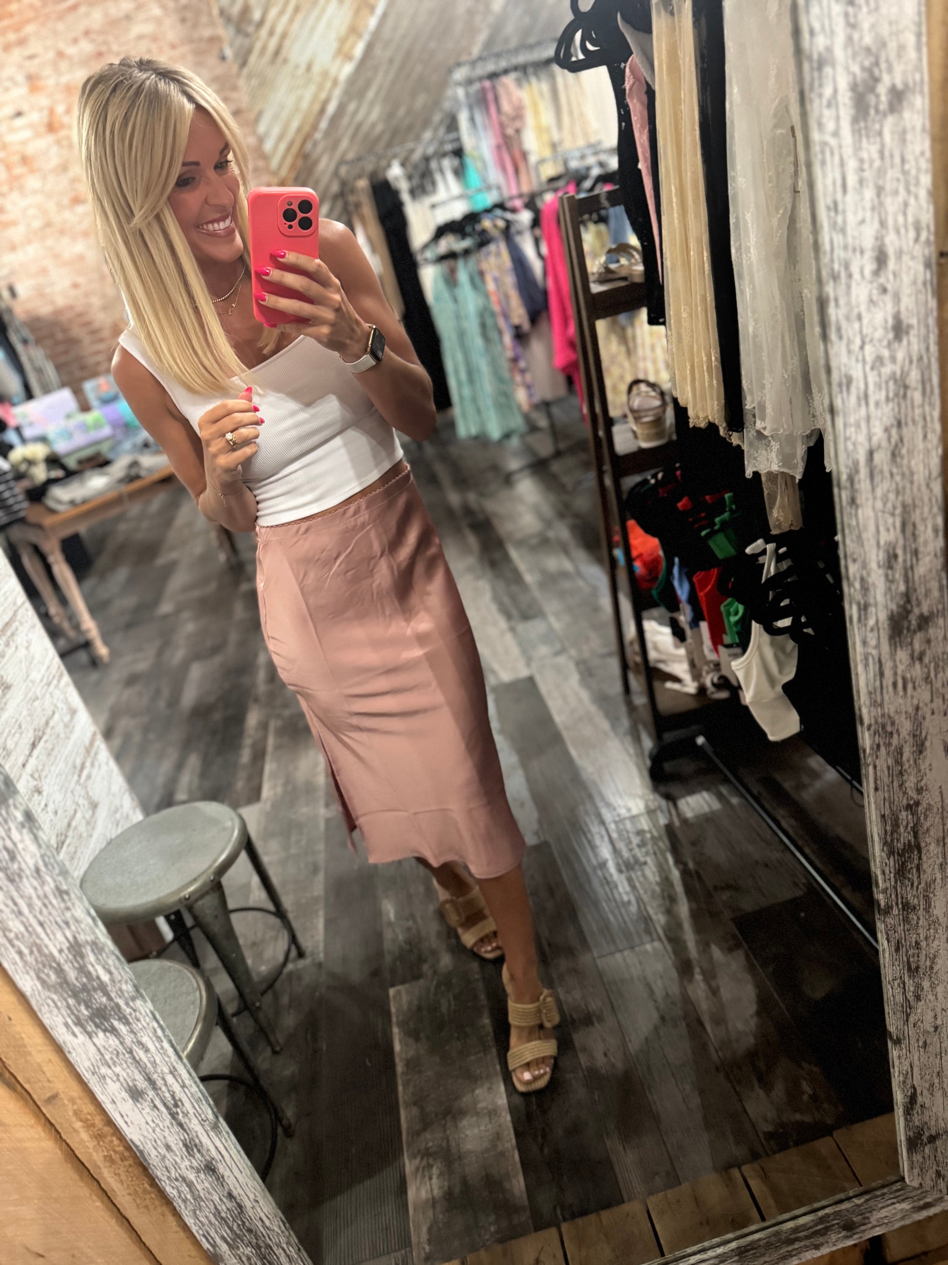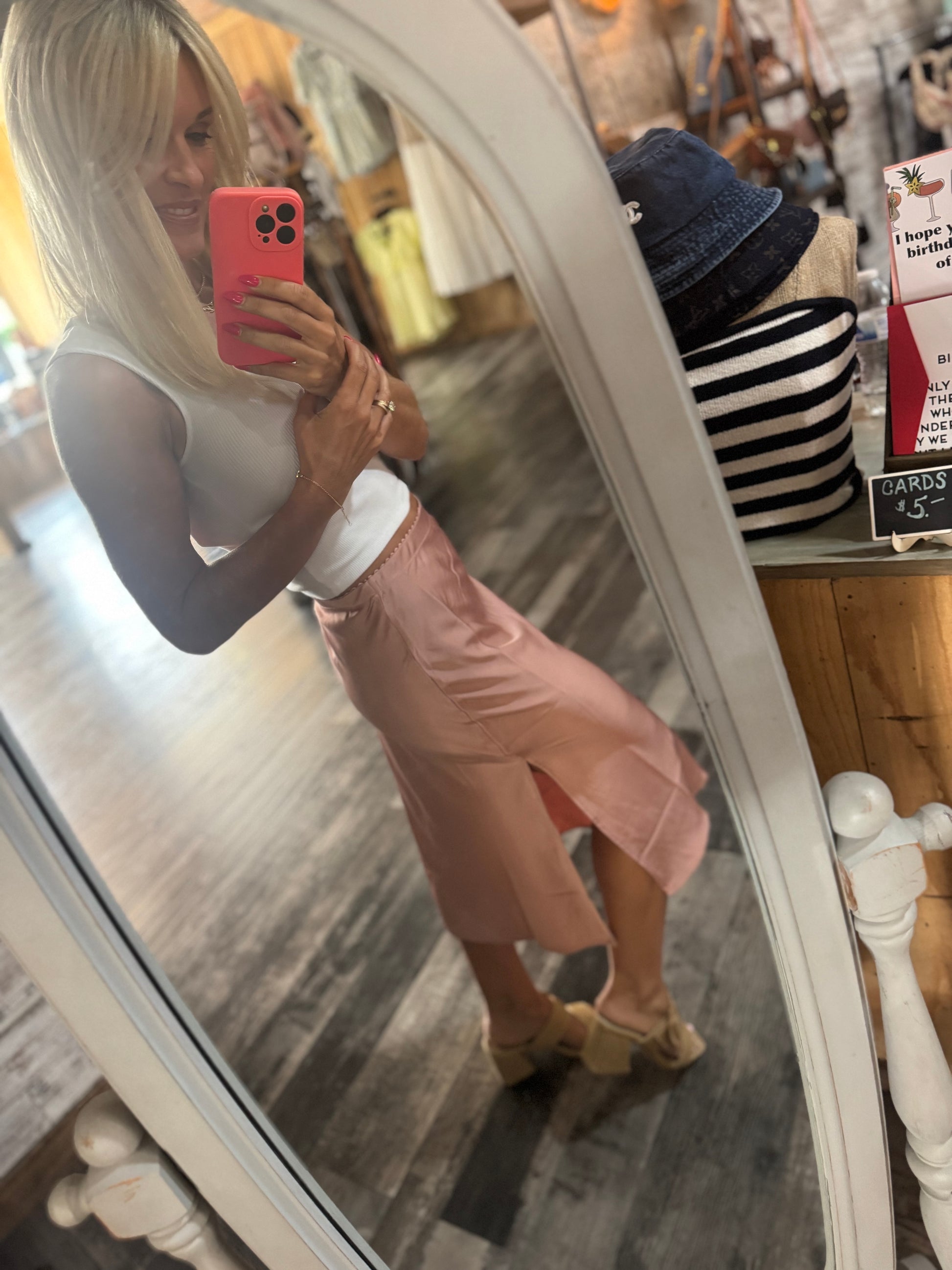 Side slit, maxi skirt, small side slit, runs true to size, elastic band waist